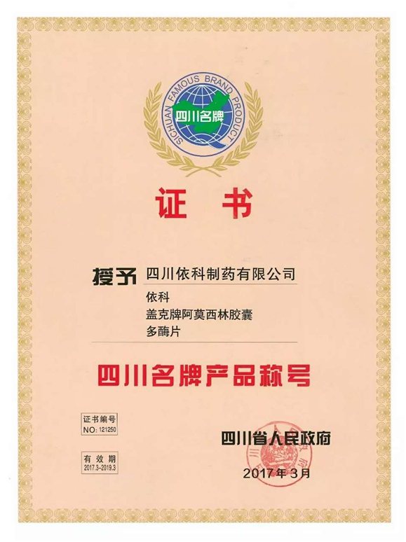 公司高度重视品牌战略,依法注册了“盖克”、“蜀中”、“三星堆”、“阿莫锋”、“益善源”、“蓉通”、“pg夺宝赏金女王”等108件注册商标,1999年“盖克”、2003年“蜀中”、2007年“三星堆”被认定为德阳市知名商标,2001年“盖克”、2004年“蜀中”被认定为四川省著名商标, 2008年“盖克”商标被国家工商行政管理总局认定为“中国驰名商标”。2017年3月,公司盖克牌、pg夺宝赏金女王牌阿莫西林胶囊和多酶片被四川省人民政府授予四川名牌产品称号。2016年,公司实现营业收入66373万元,利税7600万元;2017年,公司实现营业收入75045万元,利税7572万元。公司2017年被命名为德阳市第七批院士专家工作站,2016-2018连续三年被德阳市人民政府确定为重点龙头企业。